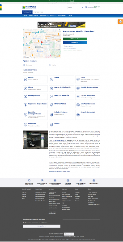 La web Euromaster corporativa se diseña para ofrecer confianza inmediata y rutas evidentes hacia servicios, red de centros y ayuda; además, prioriza accesibilidad, claridad editorial y un SEO técnico que sostiene el crecimiento orgánico.
